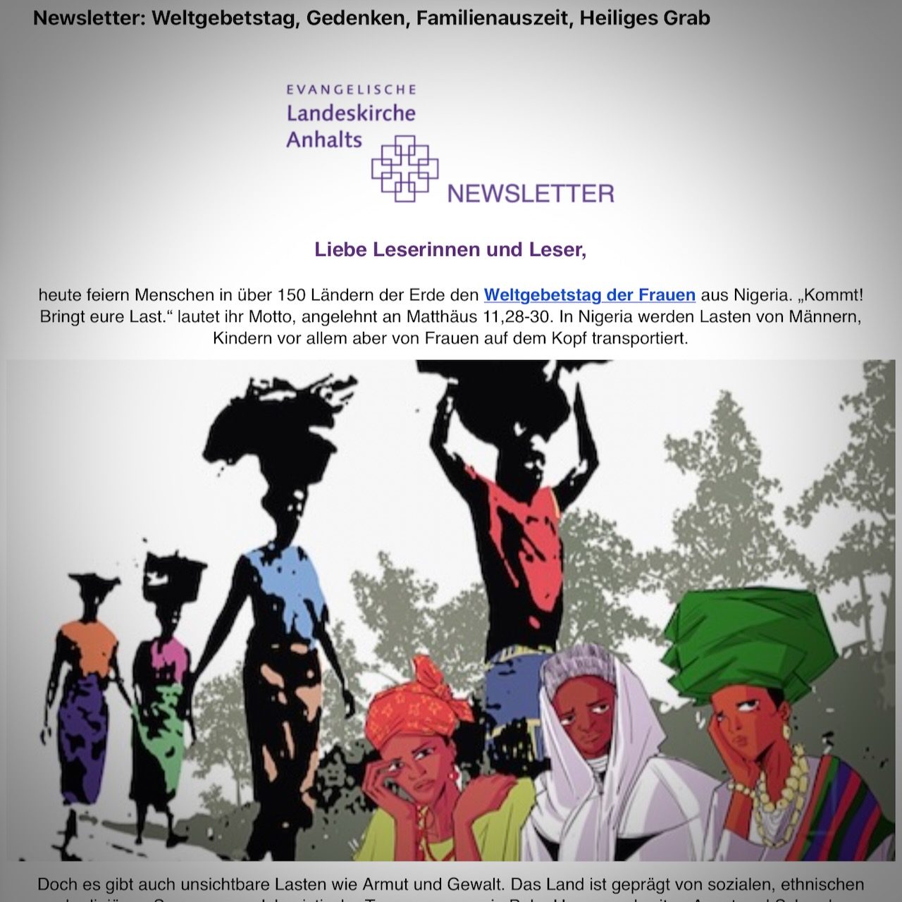 Alle zwei Wochen gibt die Pressestelle der Landeskirche einen Newsletter heraus. Er enthält kompakte Infos über Ereignisse und  Veranstaltungen sowie Rubriken und weiterführende Links.