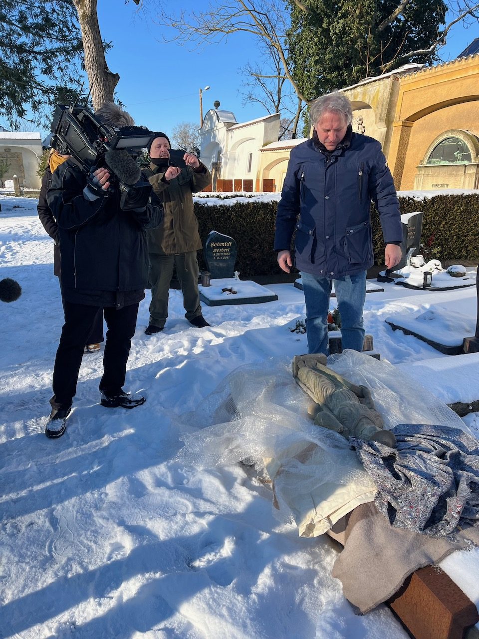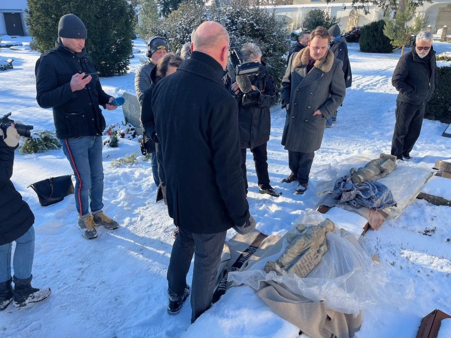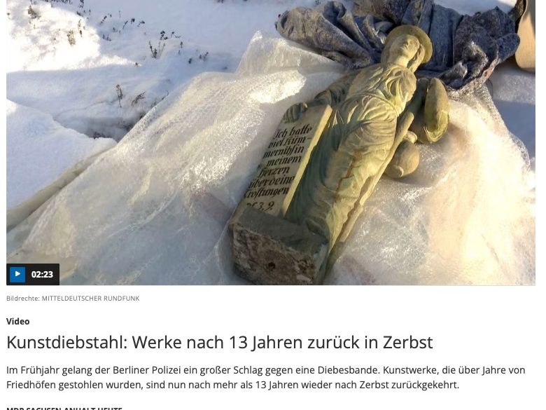 Zwei seit 13 Jahren vermisste Sandsteinskulpturen sind heute an ihren angestammten Platz auf den Frauentorfriedhof in Zerbst zurück gekehrt. René Allonge von der Polizei Berlin, Abteilung Kunstdelikte, hat die beiden Figuren nach Zerbst gebracht und dem Eigentümer übergeben.