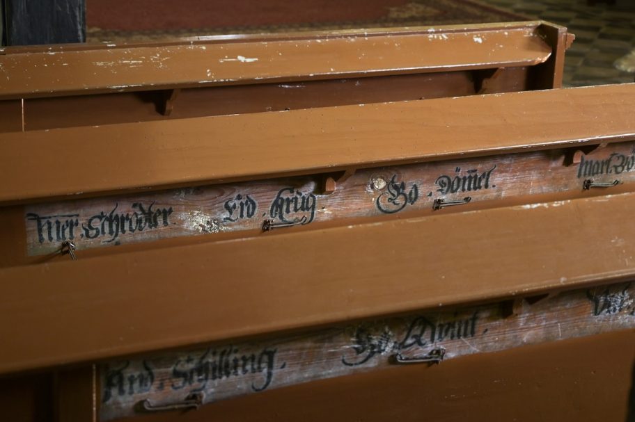 Das Gestühl unter den Emporen trägt noch auf einigen Bänken die Namen der Bürger des 18. Jahrhunderts. Zwei Fenster im Chor zeigen Luther und Melanchthon.