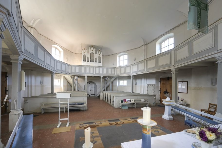Da die Kirche bis auf die Emporen ihre gesamte historische Ausstattung aus der Barockzeit verloren hat, bestimmten die neuen farbenprächtigen Fenster von Thomas Kuzio von 2016 das Raumbild in besonderer Weise. Sie entstanden im Rahmern des Projekts LICHTUNGEN.