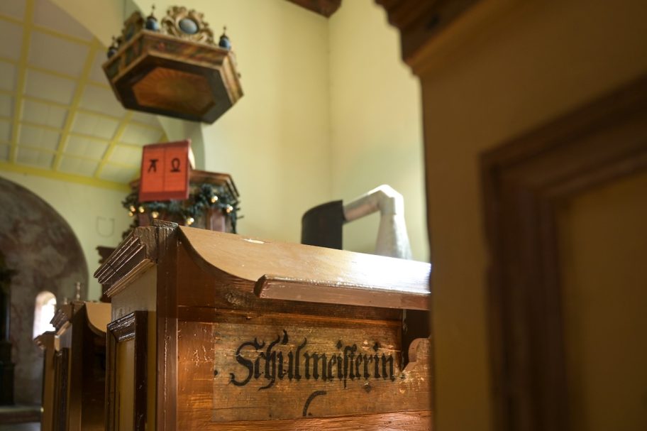 Besonders interessant ist das Innere der Kirche; sie wurde 1705-20 neu ausgestattet. In der Apsis wurden für unsere Region sehr seltene Fresken aus dem Barock freigelegt mit den Evangelisten, dem Jüngsten Gericht und Gottvater über dem Altar. Altar (1718) und Kanzel zeigen sehr qualitätvolle Gemälde.