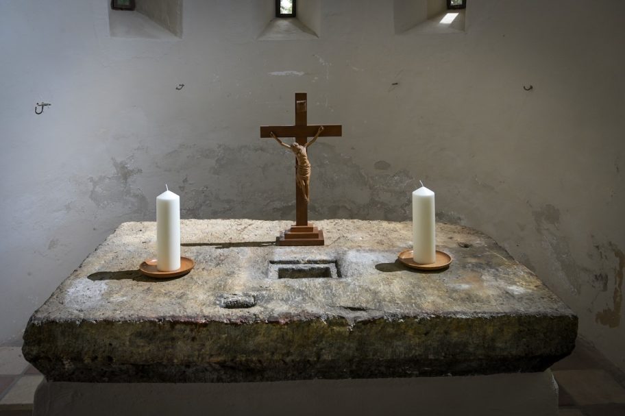Das Kreuz, das im Triumphbogen schwebt, stand wohl ursprünglich als Kruzifix auf dem hölzernen Altartisch.