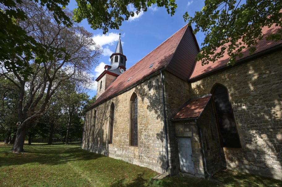 Die romanische Dorfkirche bei Köthen aus dem 12. Jahrhundert gilt als älteste Kirche der Region. Sie ist auf kreuzförmigem Grundriss aus Bruchstein errichtet und besteht aus Schiff, Querhaus, Chor und Apsis. Ungewöhnlich ist der quadratische Vierungsturm mit Satteldach über der Kreuzung von Langhaus und Querhaus.