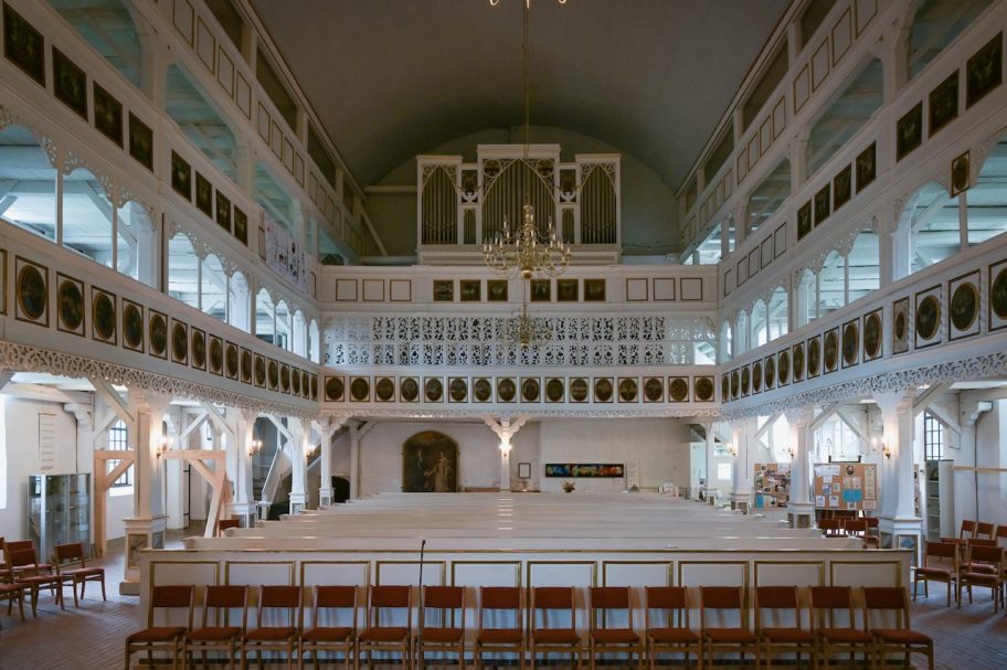 Im Inneren gibt es keine Dekoration. Umlaufende Emporen umschließen den Raum bis fast zum Altarbereich. Auf diese Weise ist hier das Ideal eines Kirchenbaus für den reformierten Glauben verwirklicht.