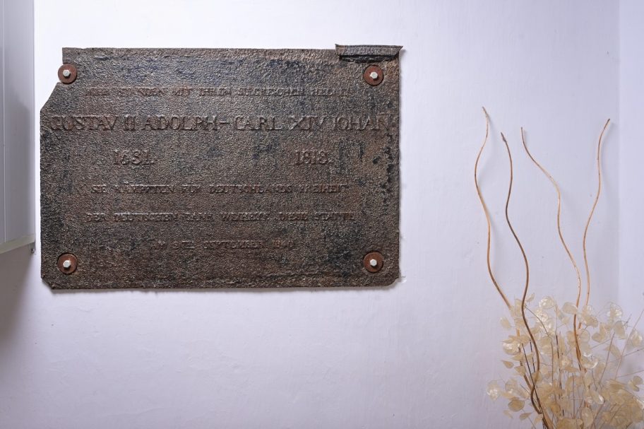 Der Name der Kirche erinnert an den schwedischen König Gustav Adolf, der 1632 bei Lützen fiel und 1631 in dieser Gegend lagerte. An dieses Ereignis wurde 1840 mit einem Feldstein-Denkmal erinnert, dem sogenannten Schwedenstein. Eine ursprünglich daran angebrachte Gedenktafel ist erhalten und heute im Eingangsbereich der Kirche zu sehen. Sie verweist auch auf den Aufenthalt des schwedischen Kronprinzen Karl Johann, des ehemaligen französischen Generals Bernadotte, im Jahr 1813.