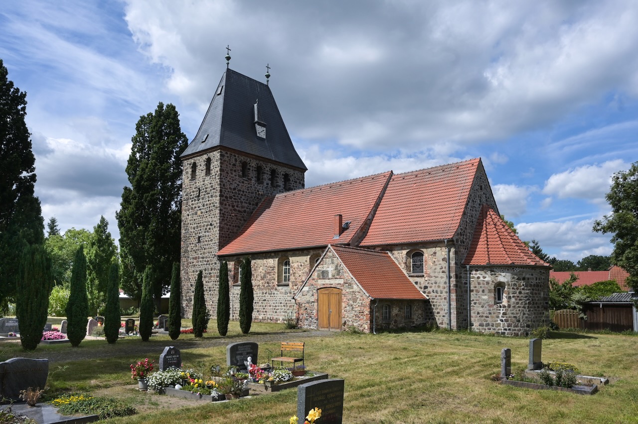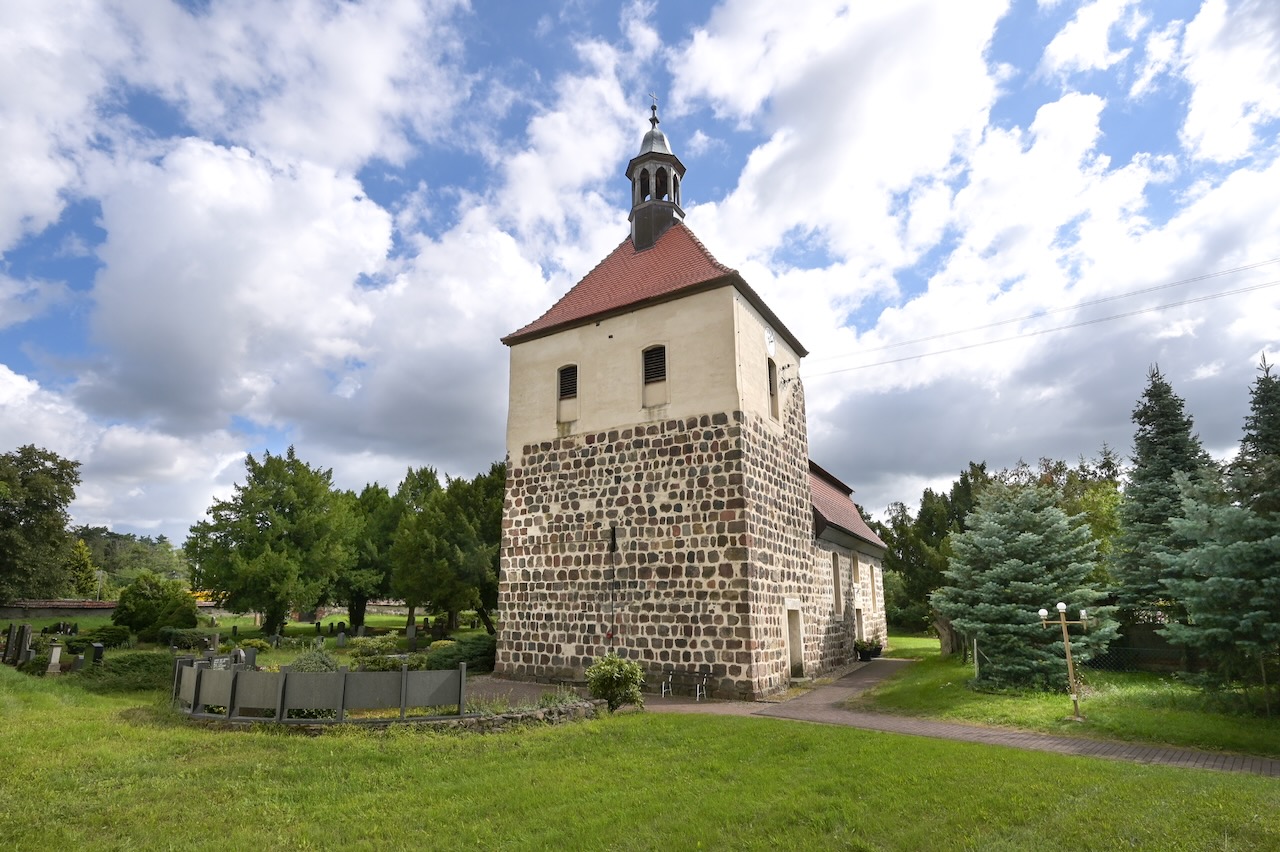 Die romanische Dorfkirche bei Köthen aus dem 12. Jahrhundert gilt als älteste Kirche der Region. Sie ist auf kreuzförmigem Grundriss aus Bruchstein errichtet und besteht aus Schiff, Querhaus, Chor und Apsis. Ungewöhnlich ist der quadratische Vierungsturm mit Satteldach über der Kreuzung von Langhaus und Querhaus.