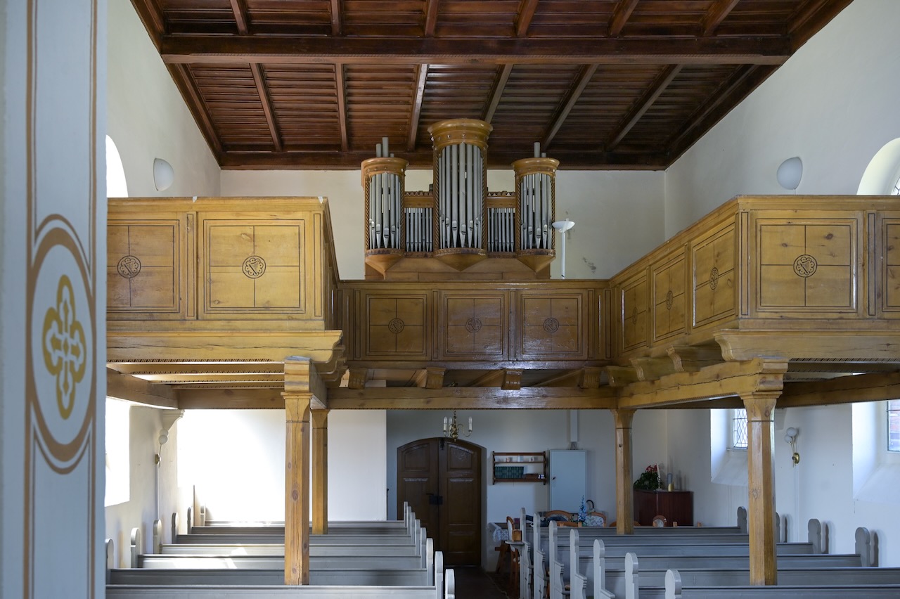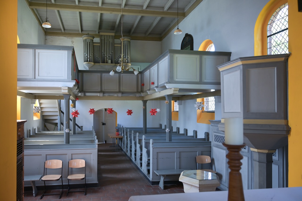 Da die Kirche bis auf die Emporen ihre gesamte historische Ausstattung aus der Barockzeit verloren hat, bestimmten die neuen farbenprächtigen Fenster von Thomas Kuzio von 2016 das Raumbild in besonderer Weise. Sie entstanden im Rahmern des Projekts LICHTUNGEN.