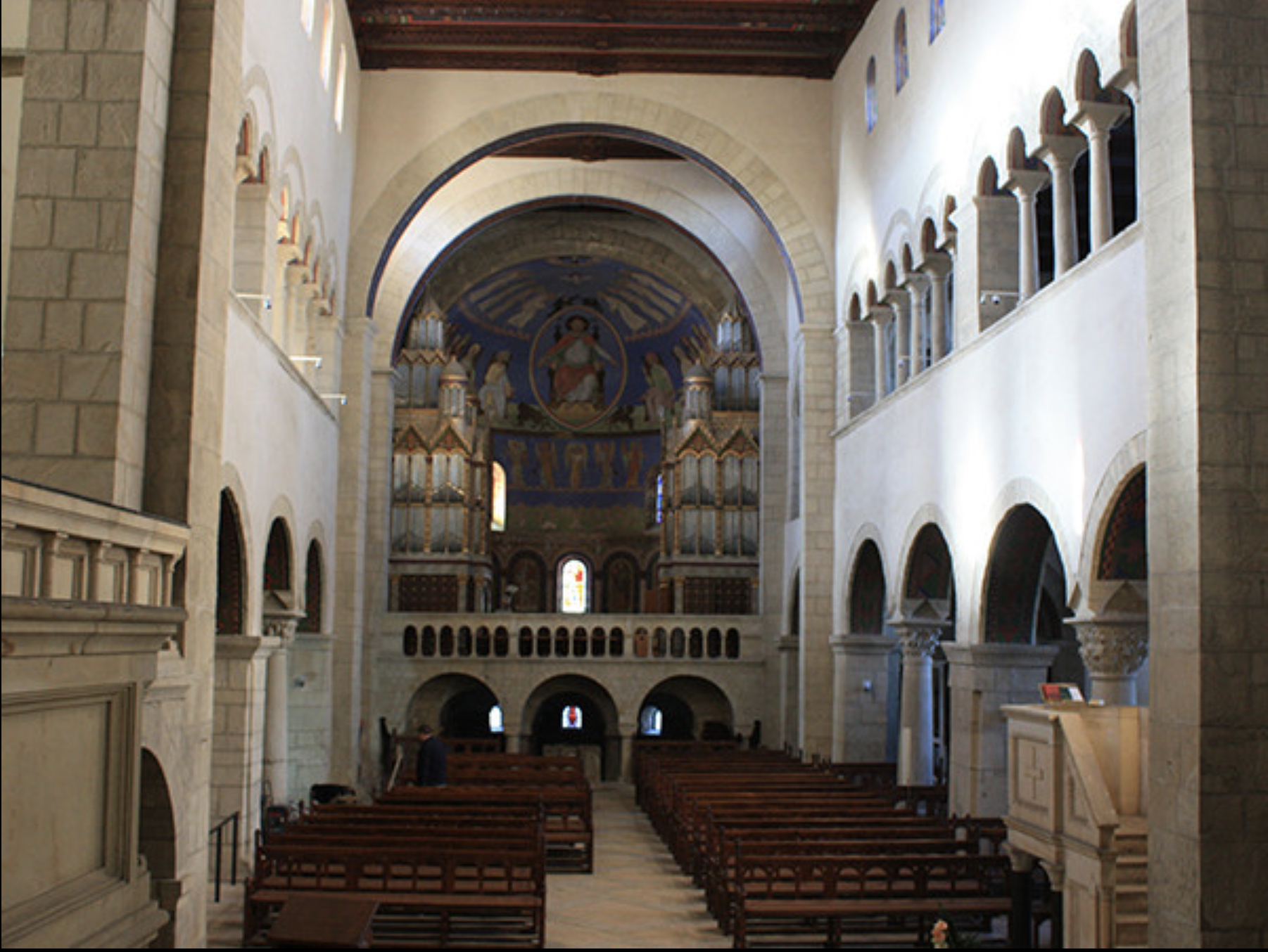 Das Gotteshaus ist eine kreuzförmige, dreischiffige Kirche. Der quadratische Schematismus, besonders im gebundenen System betont der Stützenwechsel die geometrische Struktur des Gebäudes. Kapitelle, Ornamente und Reliefs präsentieren eine entwickelte Spätromanik.