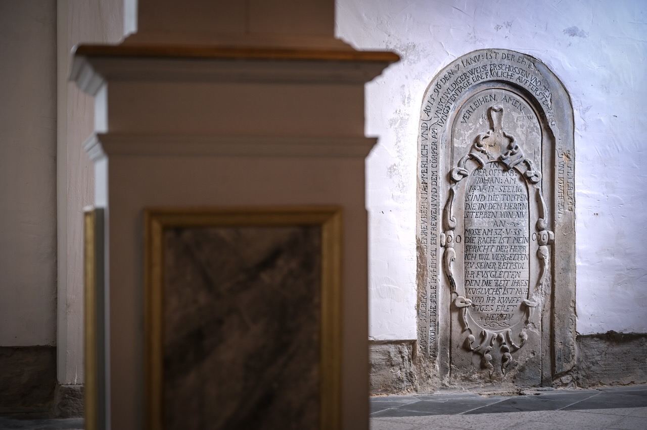 In der Kirche befindet sich der Grabstein des 1523 verstorbenen letzten katholischen Geistlichen.