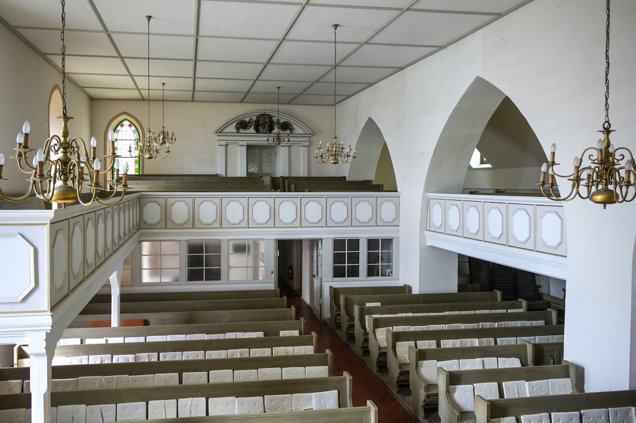 Im Inneren gibt es keine Dekoration. Umlaufende Emporen umschließen den Raum bis fast zum Altarbereich. Auf diese Weise ist hier das Ideal eines Kirchenbaus für den reformierten Glauben verwirklicht.