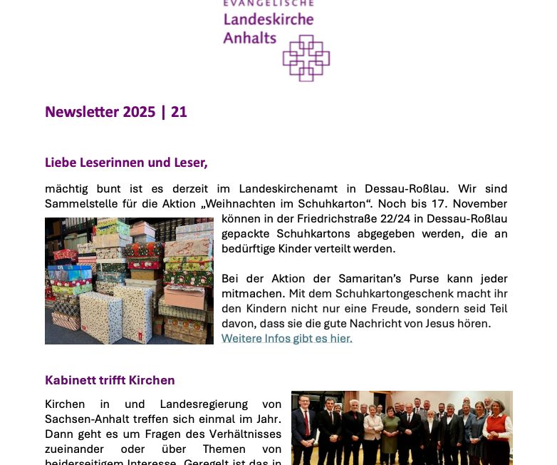 Hier finden Sie aktuelle Meldungen und Pressemitteilungen über das Geschehen und Ereignisse in der Evangelischen Landeskirche Anhalts und ihren Gemeinden.