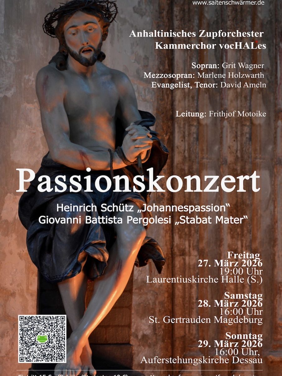 Die Instrumentalbegleitung übernimmt eine verkleinerte Besetzung des Anhaltinischen Zupforchesters; die vokalen Partien werden von Grit Wagner (Mezzosopran), Marlene Holzwarth (Alt) und David Ameln (Evangelist, Tenor) gestaltet. Gemeinsam schaffen die Ensembles eine konzentrierte, einfühlsame Atmosphäre, die zum Hören und Innehalten einlädt.Tickets kosten 15 Euro (Schüler 10 Euro)