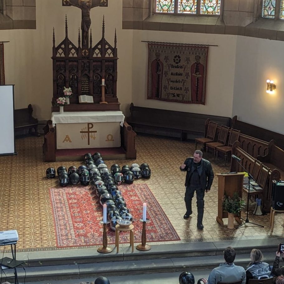 Zum Gottesdienst kamen etwa 100 Personen, etwa 60 Motorräder standen vor der Martinskirche, was erfreulich war. Denn: Erstmals sollte es danach keine große, gemeinsame Ausfahrt geben (was einige im Vorfeld mißstimmte und sie fernbleiben ließ).